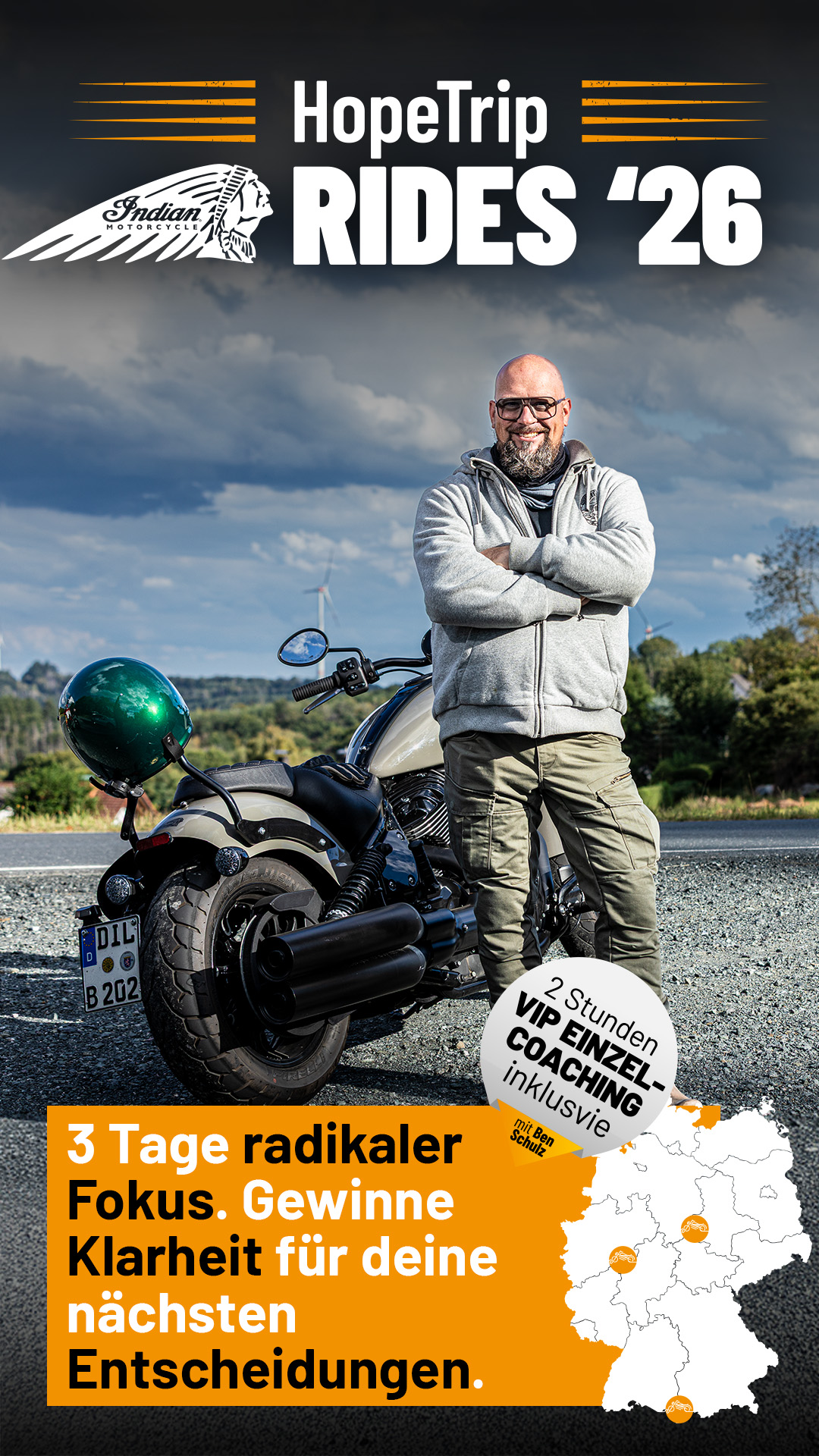 - Alle Teilnehmenden erhalten nach der Tour ein individuelles 2-Stunden VIP Einzel-Coaching (1:1) mit Ben Schulz zur persönlichen Reflexion und nachhaltigen Umsetzung.
